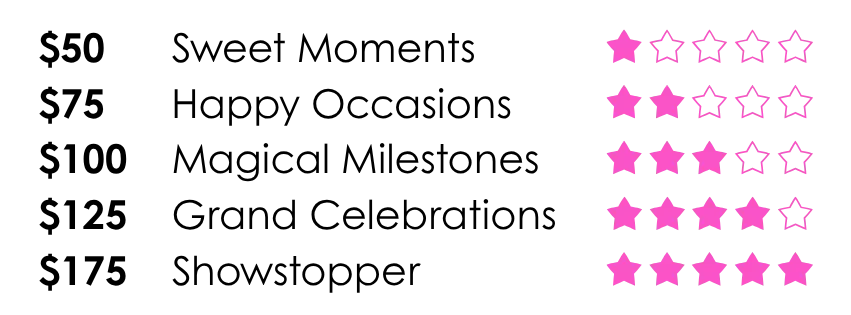 Each of our décor styles or balloon options comes with five tier pricing choices.